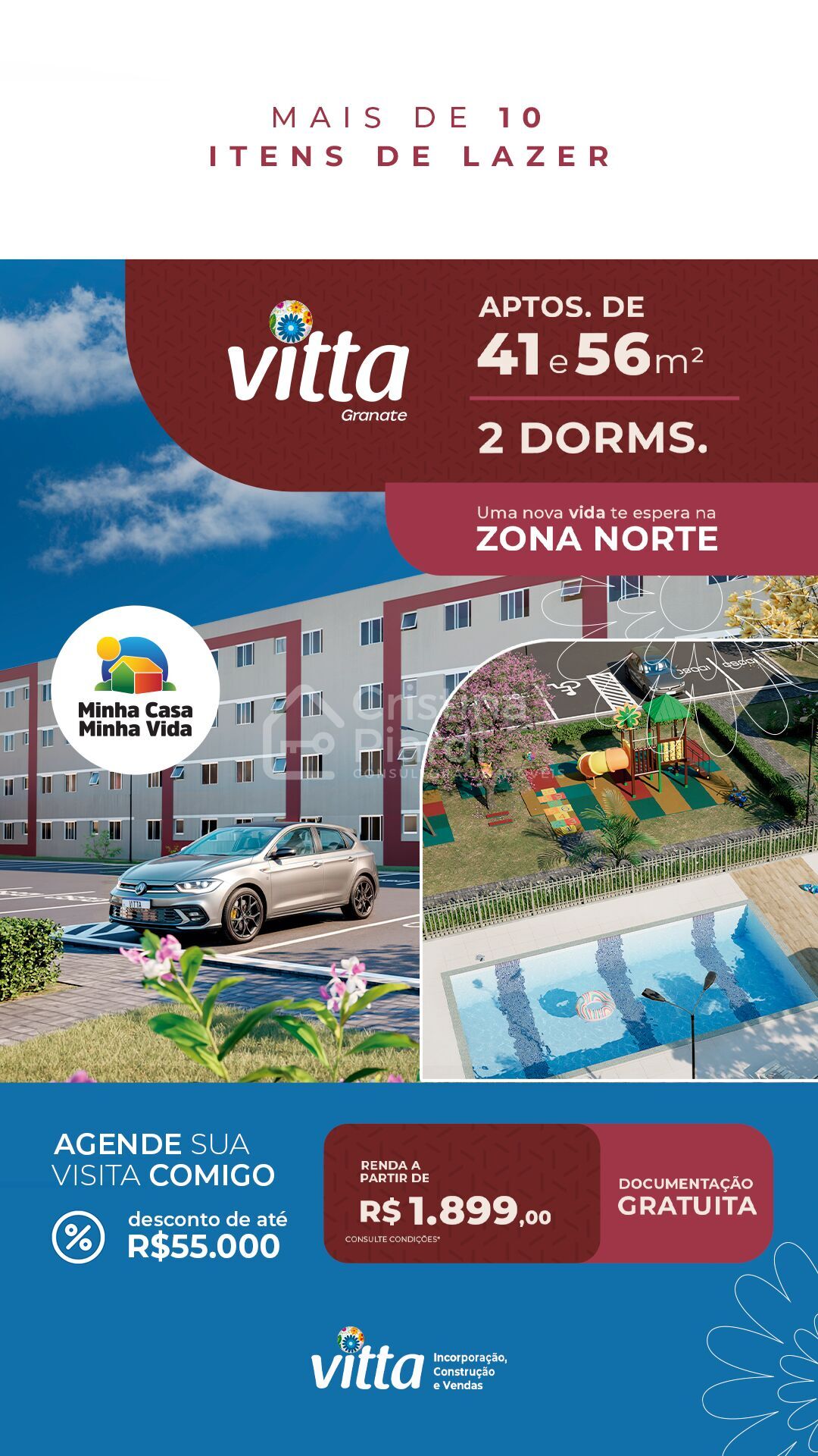 Piscina adulto e infantil, salão de festas, espaço gourmet, churrasqueira, quadra poliesportiva, academia, playground, horta, espaço pet, car wash e muito mais.